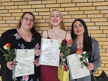 Foto: Denise Aigner, Salina Ganther und Nesrin Erdem (v.l.) mit ihren Urkunden und Rosen in der Hand.