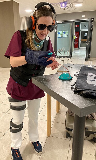 Im Foyer des Emmericher Krankenhauses stellten die Auszubildenden Naomi Evers (MFA), Lena Köpp (Kauffrau im Gesundheitswesen) und Janine Barts (Pflegefachfrau) die Inhalte ihrer Ausbildungen vor. An verschiedenen Stationen wurden eine Blutentnahme nachgestellt, der Blutdruck gemessen und mit Hilfsmitteln die möglichen Einschränkungen im Alter nachgestellt (s. Foto).
