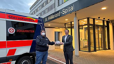 Eine schöne nachweihnachtliche Bescherung gab es jetzt für das Projekt „Sternstunden“ der Johanniter in Emmerich. Dr. Alexander Schmithausen (Foto, r.), Krankenhausdirektor des St. Willibrord-Spitals, übergab 850 Euro an Pascal Wieners, Standortleiter der Johanniter. Das Geld hatten Besucher:innen im Laufe des Jahres für Corona-Schutzmasken gespendet.