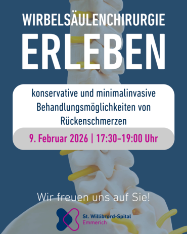 Am 9. Februar 2026 laden wir Sie herzlich zu unserer medizinischen Infoveranstaltung „Wirbelsäulenchirurgie erleben – konservative und minimalinvasive Behandlungsmöglichkeiten von Rückenschmerzen“ ein.