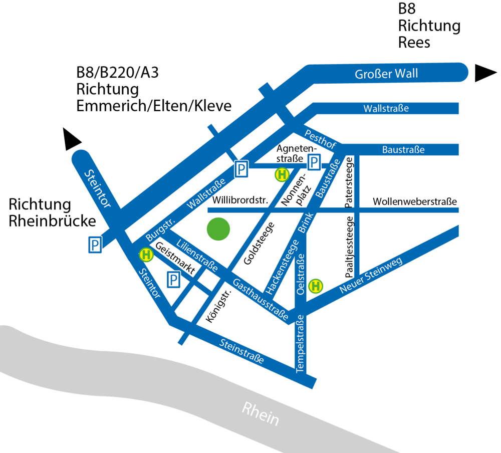 Vor dem Krankenhaus befindet sich ein öffentlicher Parkplatz (neben der Sparkasse). Diesen können Sie über die Willibrordstraße oder die Agnetenstraße erreichen. Sollten Sie hier keinen Parkplatz mehr finden, weichen Sie auf den Parkplatz auf dem Geistmarkt aus.
